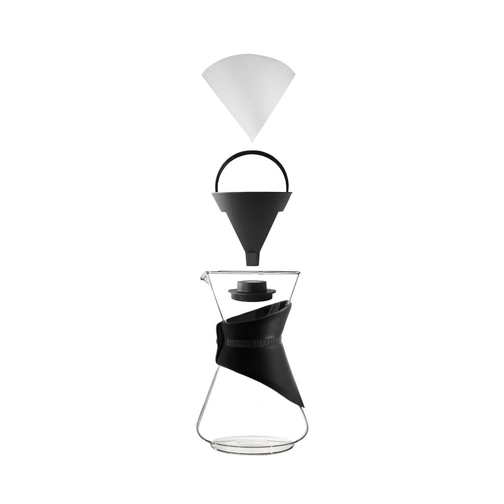 The stylish pour-over coffee brewer BLOOM AND FLOW, winner of the GOOD DESIGN Award, can be operated with any standard paper cone filter (No.2 and No.4) or any V-shape filter, allowing you to brew either 2, 4 or 6 cups. Brewer consists of the heat-resistant glass carafe and a unique funnel insert, providing an optimised blooming and flow of your coffee through the filter paper.
